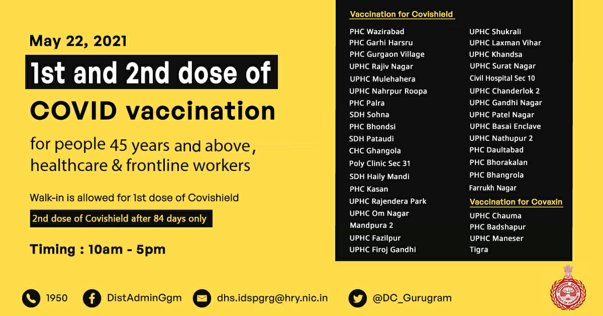 गुरुग्राम में 45 प्लस वाले आज यहाँ लगवाएं वैक्सीन, देखें लिस्ट Gurgaon LiveLatest Update By PBK News On May 22, 2021 189 Share 189 Share FacebookTwitterGoogle+ReddItWhatsAppPinterestEmail