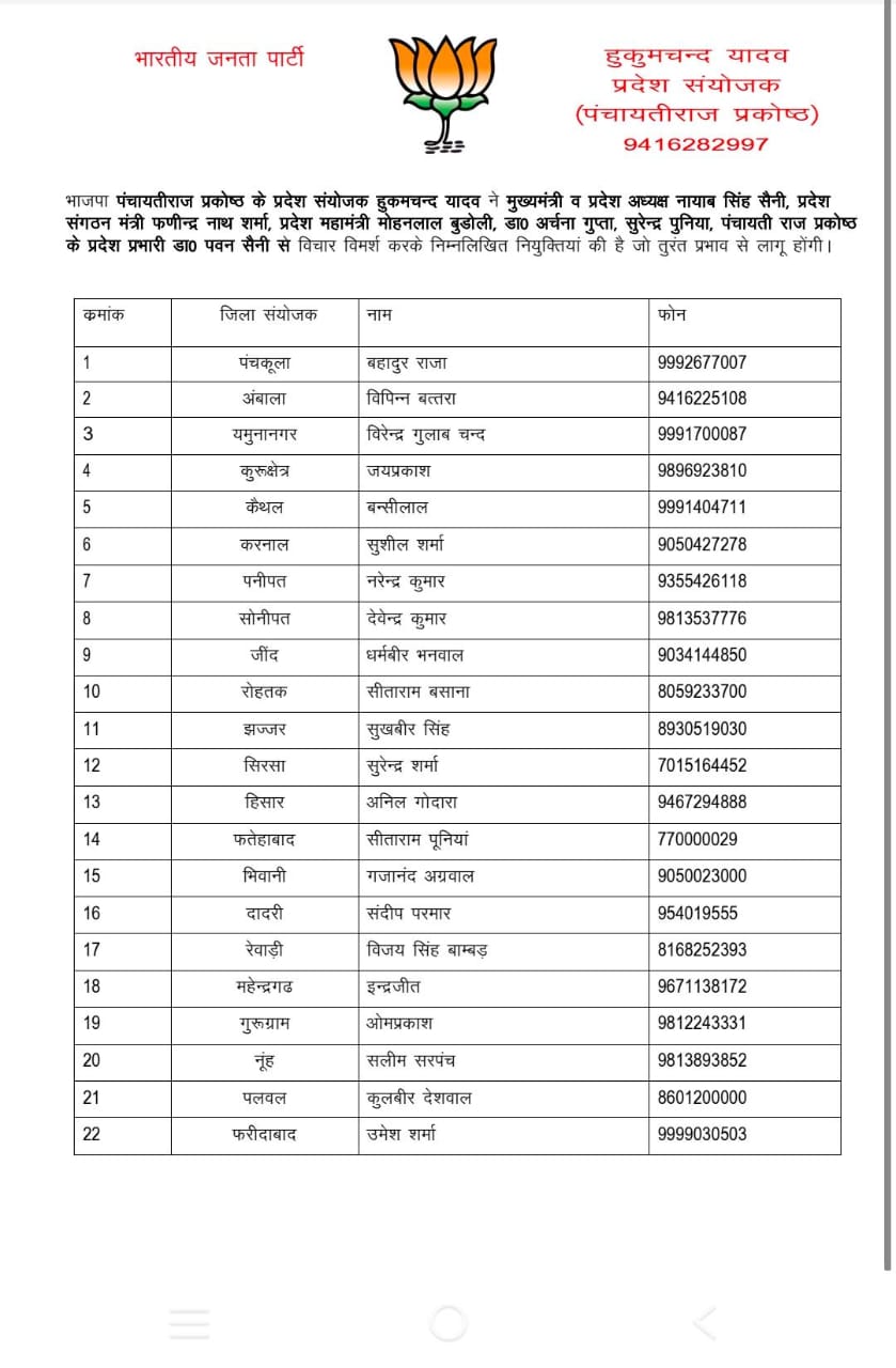 बादशाहपुर, 3 अप्रैल (अजय) : भारतीय जनता पार्टी के पंचायतीराज प्रकोष्ठ के नए जिला संयोजक के रूप में ओम प्रकाश की न्युक्ति की गई है। वर्तमान में ओम प्रकाश गुरुग्राम जिला परिषद के वाइस चेयरमैन हैं। ओम प्रकाश ने इस नियुक्ति के लिए मुख्यमंत्री नायाब सिंह सैनी और प्रदेश संयोजक हुक्मचंद सहित शीर्ष नेताओं का आभार व्यक्त किया। उन्होंने विशेषकर उन सभी नेताओं का शुक्रिया अदा किया, जिन्होंने उनकी न्युक्ति में अपनी सहमती देकर उनपर भरोसा जताया है और उन्हें इस महत्वपूर्ण पद के लिए चयनित किया।  भाजपा के नेताओं तथा ओम प्रकाश के समर्थकों कृष्ण सिलानी एवं अन्यों की माने तो उनका अनुभव और कार्यक्षमता पंचायतीराज क्षेत्र में उन्हें एक विशेष रूप से उपयुक्त बनाता है। उन्होंने अपने पूर्व योगदान और नेतृत्व के साथ जिला परिषद के उत्तम विकास और कल्याण के लिए कई महत्वपूर्ण पहलुओं में भूमिका निभाई है। ओम प्रकाश का पंचायतीराज प्रकोष्ठ में उपयुक्त चयन पंचायतीराज क्षेत्र में नई ऊर्जा और दिशा देने की दिशा में एक महत्वपूर्ण कदम है। उन्हें इस दायित्व को निभाने के लिए उनके समर्थकों द्वारा शुभकामनाएं दी जा रही हैं और लोगों की आशा है कि वे अपने नेतृत्व में पंचायतीराज क्षेत्र को विकास और समृद्धि की नई ऊर्जा से प्रदान करेंगे।