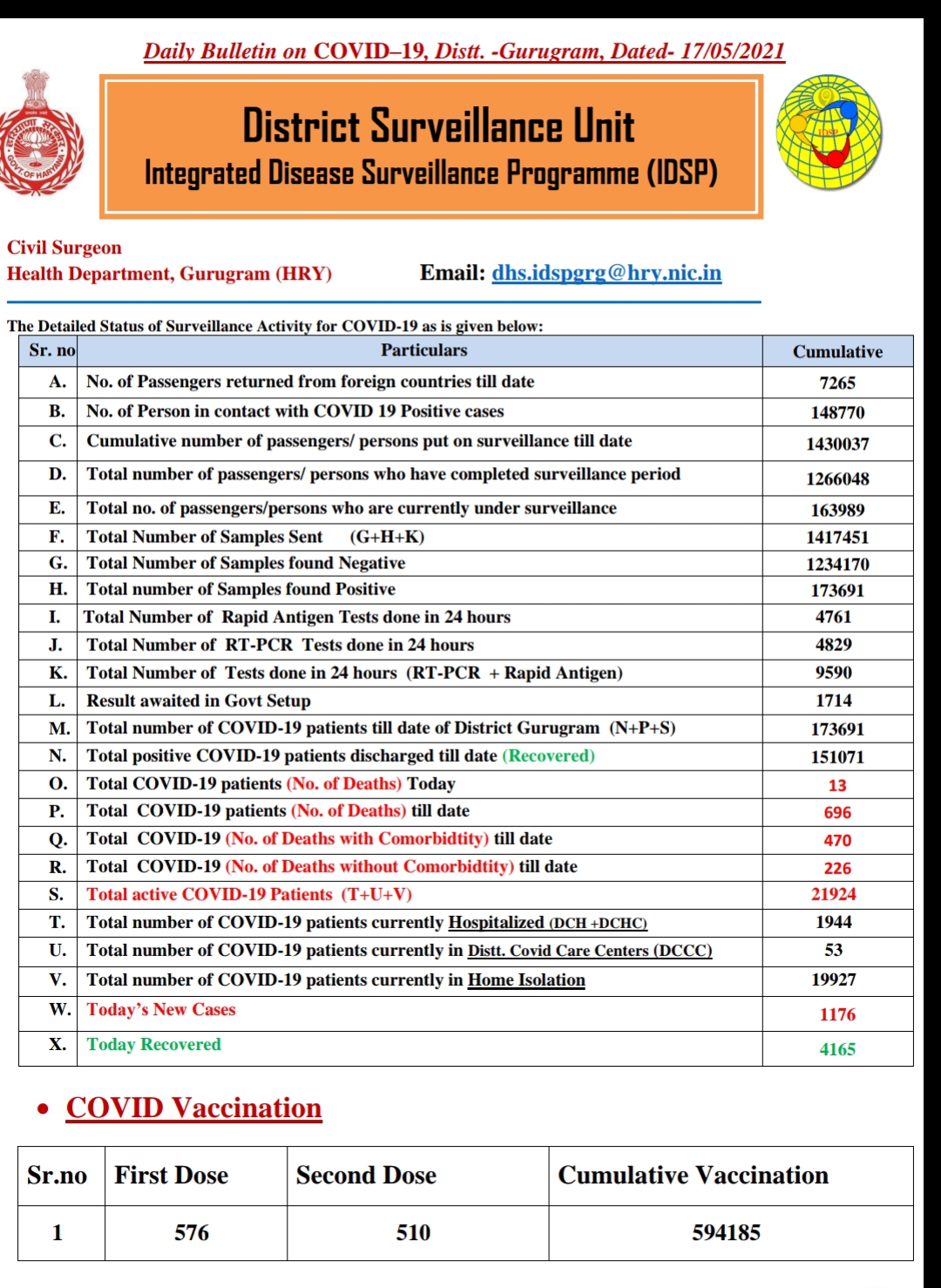 गुरुग्राम में 1176 आज कोरोना के मामलों की पुष्टि, 13 की मौत Breaking NewsFeaturedGurgaon Live By PBK News On May 17, 2021 147 Share 147 Share FacebookTwitterGoogle+ReddItWhatsAppPinterestEmail