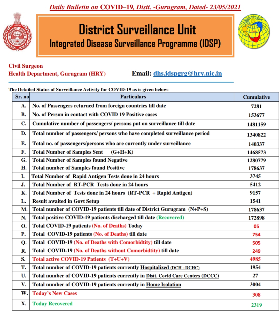 308 कोरोना के आज गुरुग्राम में आये मामले, 2319 हुए ठीक व 5 की मौत Breaking NewsGurgaon LiveNCR Khabar khazana By PBK News On May 23, 2021 172 Share 172 Share FacebookTwitterGoogle+ReddItWhatsAppPinterestEmail