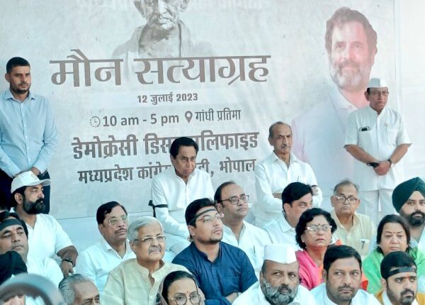 पीसीसी मुख्यालय के बाहर बड़ी संख्या में कांग्रेस कार्यकर्ता काला बिल्ला लगाकर मौन सत्याग्रह पर बैठे हैं। पूर्व मुख्यमंत्री कमलनाथ, कांग्रेस के प्रदेश प्रभारी जेपी अग्रवाल, पूर्व केंद्रीय मंत्री अरुण यादव समेत तमाम सीनियर नेता इस सत्याग्रह में शामिल हुए। सत्याग्रह शुरू होने से पूर्व कांग्रेस नेताओं ने कहा कि राहुल गांधी को संसद से बाहर रखने का जो षड्यंत्र रचा गया है, उसके खिलाफ कांग्रेस देशव्यापी मौन सत्याग्रह कर रही है।