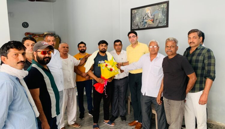 बादशाहपुर, 6 अप्रैल (अजय) : गाँव टीकरी के निवर्तमान पार्षद कुलदीप यादव व भाजपा मण्डल उपाध्यक्ष रमेश बेनीवाल व गणमान्य लोगों ने मिस्टर हरियाणा जूनियर बॉडी बिल्डिंग प्रतियोगिता में गोल्ड मैडल विजेता हर्ष बैनीवाल के अपने गाँव पहुँचने पर स्थानीय लोगों ने भव्य स्वागत किया। पार्षद कुलदीप यादव ने बताया कि हर्ष बेनीवाल ने ओपन क्लासिक चैपियन में भी गोल्ड मेडल हासिल किया और उसके अलावा विभिन्न प्रतियोगिताओं में सिल्वर व ब्रोंज मैडल भी हासिल कर चुका है। पूरे भारत की चैंपियनशिप में टॉप 10 में भी अपना स्थान बनाया है। रमेश बैनीवाल ने बताया कि हर्ष ने अपने गाँव ही नही बल्कि पूरे हरियाणा का नाम रोशन किया है। जिसकी वजह से पूरे गाँव मे ख़ुशी की लहर है। कार्यक्रम के दौरान कर्ण सिंह, रणबीर सिंह, सतबीर, नवल सिंह, रणसिंह, सुरेंदर होशियार व संजीत बैनीवाल आदि गणमान्य लोग उपस्थित रहे।