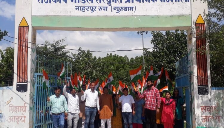 बादशाहपुर, 10 अगस्त (अजय) : गुरुग्राम के नाहरपुर रूपा गाँव में स्थित जीपीएस सरकारी स्कूली छात्रों द्वारा क्षेत्र में तिरंगा यात्रा निकालते हुए हर घर तिरंगा फेहराने की अपील की। इस मौके पर उदयवीर अंजना सरपंच, निगम पार्षद सुदेश अंजना, सुनील पार्षद, निखिल हंस, रामबीर हंस सहित कमलेश, मिथलेश, संतोष, रमेश, लखीराम, राकेश, सोमवीर, अनिल ने तिरंगा यात्रा का हिस्सा बनते हुए स्कूली छात्रों का होसला बढ़ाया। उदयवीर अंजना ने बताया कि आजादी के अमृत महोत्सव पर नागरिकों में राष्ट्रीय ध्वज के प्रति सम्मान व देशभक्ति की भावना जाग्रत करने के लिए स्कूली छात्रों तथा स्थानीय लोगों तथा निगम पार्षदों ने विशाल तिरंगा यात्रा निकाली। उन्होंने कहा कि देश के झंडे के सम्मान और प्रधानमंत्री नरेद्र मोदी की अपील कर हर घर तिरंगा लगाने को लेकर सभी भारतीयों में ख़ुशी की लहर है, जहां लोग आगे बढ़कर इस अभियान से जुड़ रहे है।