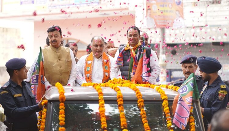 BJP mayoral candidate from Manesar Municipal Corporation, Sarpanch Sundar Lal, held a historic roadshow, demonstrating massive public support. The grand event saw participation from Haryana Cabinet Minister Rao Narbir Singh and Member of Parliament Manoj Tiwari, who rode alongside Sundar Lal in an open jeep, appealing to the people of Manesar to vote for him. The roadshow witnessed an overwhelming response, with thousands of supporters joining the rally. Floral showers from JCB machines at various points added to the celebratory atmosphere, while enthusiastic supporters lined up along the roads to welcome the BJP leader. His vehicle was adorned with flower garlands, symbolizing the immense support from the locals. Apart from the grand roadshow, Minister Rao Narbir Singh and Sundar Lal also conducted a door-to-door campaign in villages, walking through the streets to personally connect with voters. They assured the residents that BJP’s leadership in Manesar would bring unprecedented development and progress to the region. With such a strong show of strength, Sarpanch Sundar Lal’s campaign has gained significant momentum, and all eyes are now on the upcoming elections to see if this massive public backing translates into victory at the polls.