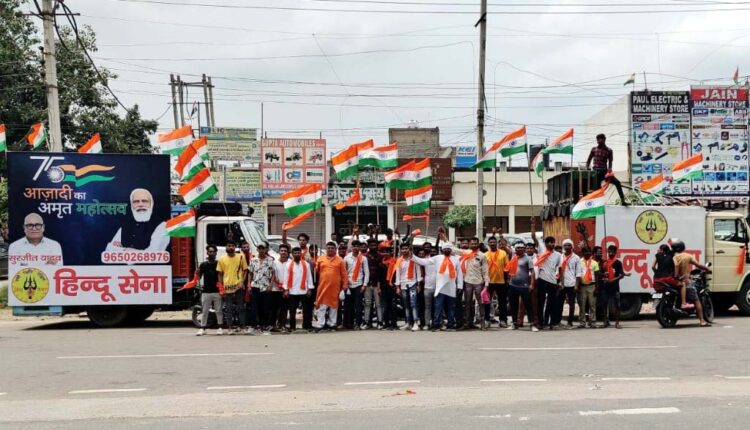 बादशाहपूर, 14 जुलाई (अजय) : देश में सक्रिय हिन्दू संगठन हिन्दू सेना ने आज गुरुग्राम शहर में करीब 21 किलोमीटर लम्बी तिरंगा यात्रा निकालते हुए तिरंगा यात्रा के माध्यम 75वां अमृतमोहत्सव मनाया। हिन्दू सेना के राष्ट्रीय उपाध्यक्ष सुरजीत यादव ने बताया कि गुरुग्राम के अलावा पुरे देश में हिन्दू सेना ने जगह-जगह 13 से 15 अगस्त तिरंगा यात्रा यात्रा निकाल कर हर घर तिरंग अभियान को कामयाब बनाने का कार्य किया है। राष्ट्रीय हितों से जुड़े कार्यो में हिन्दू सेना हमेशा अहम योगदान देने का कार्य करती आई है और आगे भी करती रहेगी। देश के वीर सपूतों ने देश को आजादी दिलाने के लिए अपने प्राणों का बलिदान देकर देश को आजादी दिलाई थी, इस तरह तिरंगा यात्रा निकालकर भारतीयों ने उन सभी वीरों को सच्ची श्रद्धांजलि देने का कार्य किया है। सुरजीत ने बताया कि इस तिरंगा यात्रा में 5 डीजे शामिल किये गये, जिसके दौरान 10 हजार झंडे शहर के लोगों को वितरित किये गये। इस दौरान 15 हजार तुलसी के पौधे, 15 हजा पटके वितरित किये गये, इसके साथ 15 अगस्त के दिन आज भी 10 हजार तिरंगा झंडे शहर के लोगों को वितरित किये जायेगें।