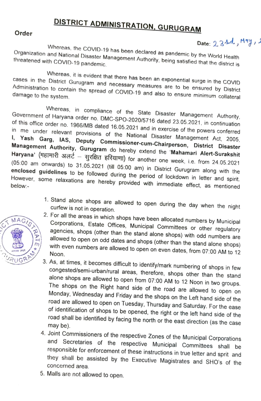 गुरुग्राम जिला उपायुक्त द्वारा आदेश में कहा गया है कि नई पाबंदियों के अनुसार दुकानदारों को दी गई छूट में नए नियमों के तहत जहां दुकानों की नंबरिंग और निशानदेही नहीं है उन लोकल मार्केट में 3-3 दिन लेफ्ट और राइट के हिसाब से दुकानें खोली जाएगी। सोमवार, बुधवार, शुक्रवार को मार्किट की मुख्य एंट्री से लेफ्ट साइड की दुकानें खुलेंगी तो वही मंगलवार, गुरुवार, शनिवार को मुख्य एंट्री से राइट साइड की दुकानें खोली जाएगी। इन नियमों को लागू कराने के लिए संबंधित अधिकारियों मुंसिपल कॉरपोरेशन के ज्वाइंट कमिश्नर, एग्जीक्यूटिव ऑफिसर, एसडीएम व क्षेत्र के थाना प्रभारी द्वारा निर्देश लागू कराने का कार्य किया जाएगा यदि इन नियमों की कोई अवहेलना करता पाया गया तो उसके खिलाफ नियमानुसार कार्रवाई की जाएगी देखें आदेश