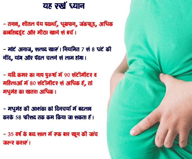 अगर शुगर है तो नीम हकीमों या सोशल साइट्स के फार्मूले के चक्कर में न पड़कर सीधे डॉक्टर से संपर्क करें। इलाज में देरी का खामियाजा भुगतना पड़ सकता है। डॉक्टर की देखरेख में थोड़ी सी सावधानी रखकर इस पर काबू पाया जा सकता है। सादा खान-पान और रोजाना चार किमी की सैर से डायबिटीज नियंत्रित रहेगी। अधिक व्यायाम और दौडऩे से बचना चाहिए क्योंकि डाइबिटीज के मरीजों में दिल की बीमारी की संभावनाएं 98 फीसद तक होती हैं।
