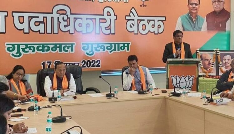 बादशाहपुर, 17 दिसम्बर (अजय) : भारतीय जनता पार्टी की महत्वपूर्ण बैठक शनिवार को गुरुग्राम स्थित भाजपा कार्यालय गुरुकमल में प्रदेश अध्यक्ष ओम प्रकाश धनखड़ की अध्यक्षता में हुई। प्रदेश पदाधिकारियों, जिला अध्यक्षों और जिला प्रभारियों की इस बैठक में नगर निगम व आगामी 2024 चुनावों को लेकर रोडमैप तैयार किया गया है। राष्ट्रीय महामंत्री अरूण सिंह और संसदीय बोर्ड की सदस्य डा. सुधा यादव व प्रदेश प्रभारी बिप्लब देब की उपस्थिति में प्रदेश अध्यक्ष ने जहां भाजपा की कल्याणकारी योजनाओं और संगठनात्मक शक्ति को लगातार चुनाव में हो रही जीत का कारण बताया और भविष्य में भी चुनौतियों से निपटते हुए और सफलताओं पर गौरव करते हुए जनसेवा के कार्यों में जुटे रहने का आह्वान भी उपस्थित पदाधिकारियों से किया। बैठक में राष्ट्रीय महामंत्री और प्रदेश अध्यक्ष ने कांग्रेस की नीतियों को भी कोसा और राहुल गांधी के बयानों को सेना का मनोबल तोड़ने वाला बताया।